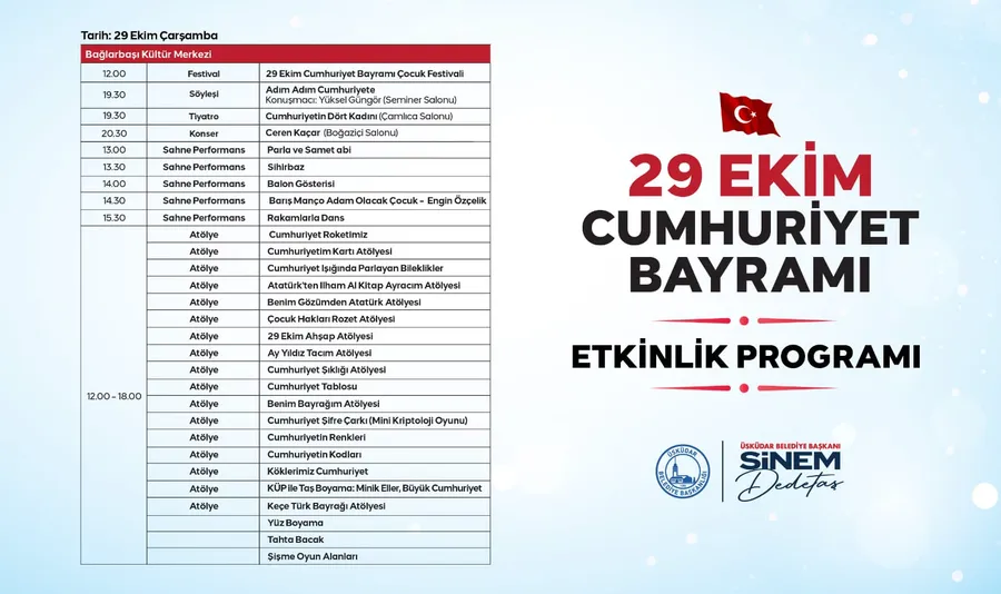 Bayram heyecanı Bağlarbaşı Kültür Merkezi’nde düzenlenecek 29 Ekim Cumhuriyet Bayramı Çocuk Festivali ile zirveye çıkacak. Saat 12.00’de başlayacak festivalde, 12.00-18.00 saatleri arasında onlarca atölye etkinliği çocukları bekliyor. Katılımcılar; Cumhuriyet Kartı, Roketimiz, Şifre Çarkı, Bayrağım, 29 Ekim Ahşap, Atatürk’ten İlham Al Kitap Ayracı, Cumhuriyetin Kodları gibi yaratıcı atölyelere katılabilecek. Gün boyunca balon gösterisi (14.00), sihirbaz performansı (13.30), dans gösterileri, tahta bacak, yüz boyama ve şişme oyun alanları ile eğlence aralıksız sürecek. Akşam programında ise 19.30’da “Adım Adım Cumhuriyete” söyleşisi (Yüksel Güngör), 19.30’da “Cumhuriyetin Dört Kadını” tiyatrosu ve 20.30’da Ceren Kaçar konseri sanatseverleri buluşturacak.