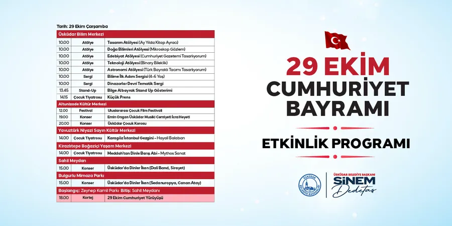 Kutlamalar sabah 10.00’da Üsküdar Bilim Merkezi’nde başlayacak. Katılımcılar, Tasarım Atölyesi (Ay Yıldız Kitap Ayracı), Doğa Bilimleri Atölyesi (Mikroskop Gözlemi), Edebiyat Atölyesi (Cumhuriyet Gazetemi Tasarlıyorum), Teknoloji Atölyesi (Binary Bileklik) ve Astronomi Atölyesi (Türk Bayraklı Tacımı Tasarlıyorum) gibi birbirinden eğitici etkinliklerde buluşacak. Gün boyunca Bilime İlk Adım Sergisi (4-6 yaş) ve Dinozorlar Devri Tematik Sergisi ziyarete açık olacak. Saat 13.45’te Bilge Albayrak Stand-Up Gösterisi, 14.15’te ise Küçük Prens Çocuk Tiyatrosu minik izleyicilerle buluşacak.
